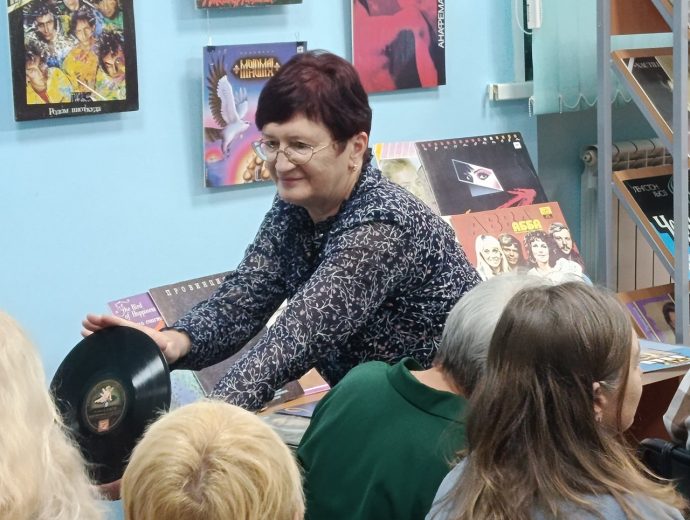 Недавно в библиотеке открылась замечательная экспозиция под названием «А музыка звучит…», на которой можно увидеть пластинки разных времён. Основная часть выставки – из собрания сотрудника библиотеки Ирины Васильевны Пырской, которая увлечённо рассказала о своей коллекции. Постоянные читатели также принесли в библиотеку не только свои любимые виниловые пластинки, но и проигрыватели.