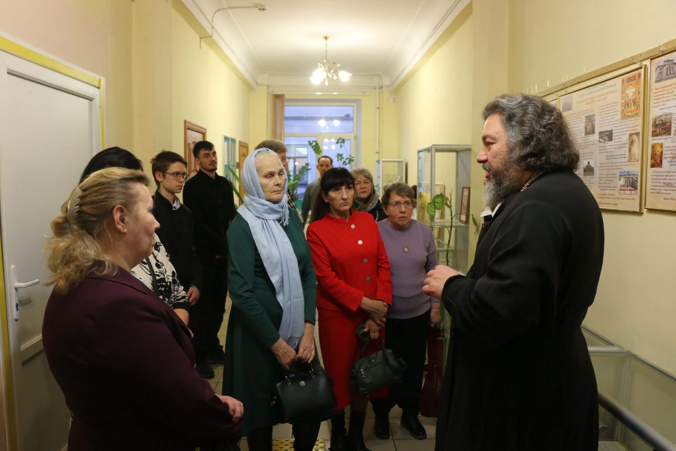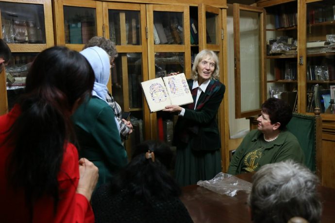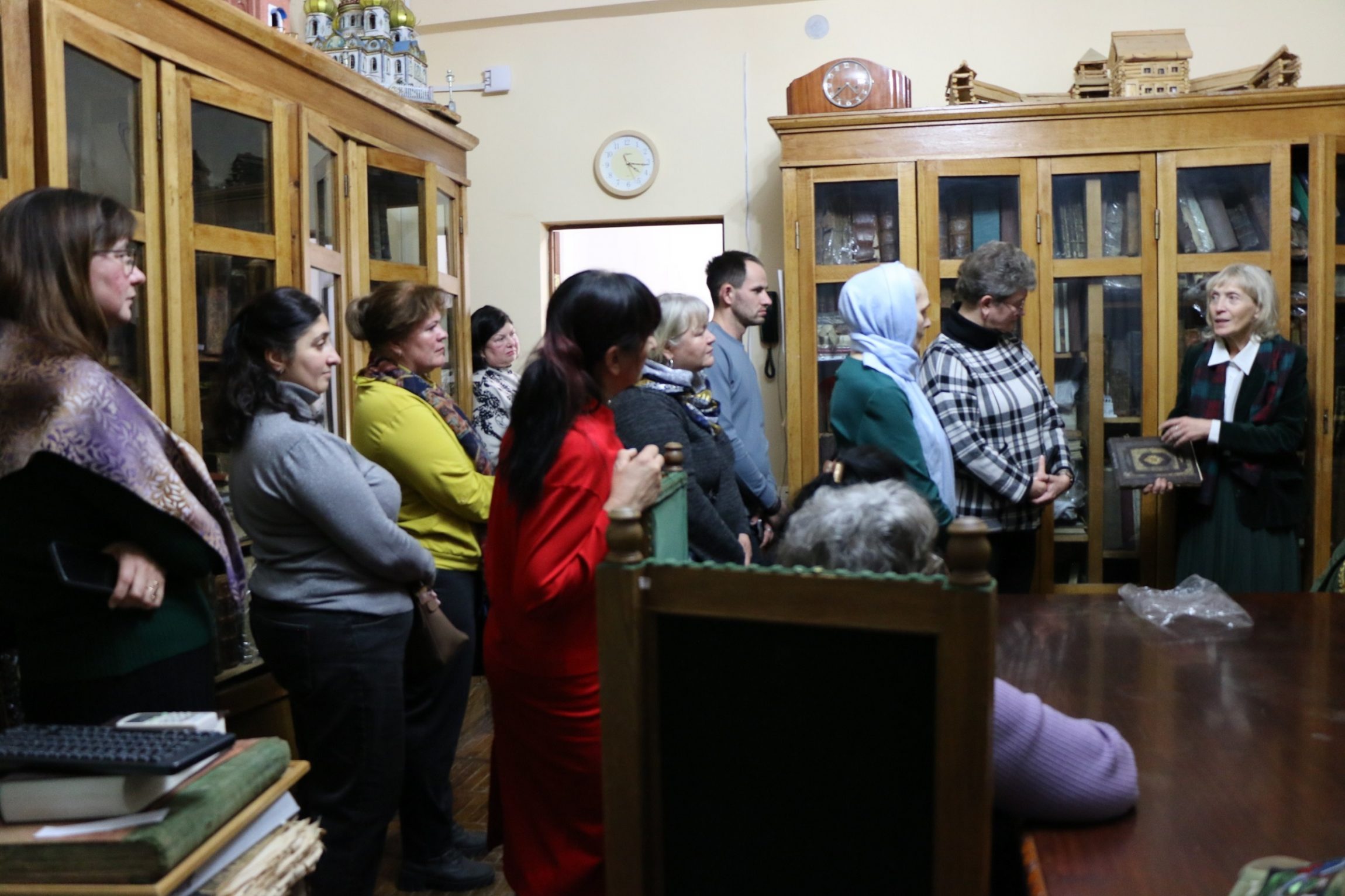 Преподаватель, хранитель музейного фонда семинарии Марина Александровна Михалёва рассказала об истории учебного заведения и познакомила гостей с отделом редкой книги. В первую очередь были представлены издания, так или иначе связанным с военными событиями, происходившими в России в разные исторические периоды. В частности, Общая минея, в которой сохранилось письмо сына родителям, написанное перед уходом на фронт в 1942 году – простым карандашом между строк, а также Октоих конца XVIII века, где неизвестный священник оставил стихотворение-посвящение воинам. Особое внимание было уделено рукописному тексту панихиды с празднично и красочно оформленным титульным листом, что у людей светских зачастую вызывает удивление. Однако, обратившись непосредственно к тексту, гости сами нашли объяснение этому факту: он весь пронизан славословием Богу как Творцу и Подателю жизни, жизни вечной, к которой теперь причастны отдавшие свои жизни воины — сыновья, мужья и братья многих из них.