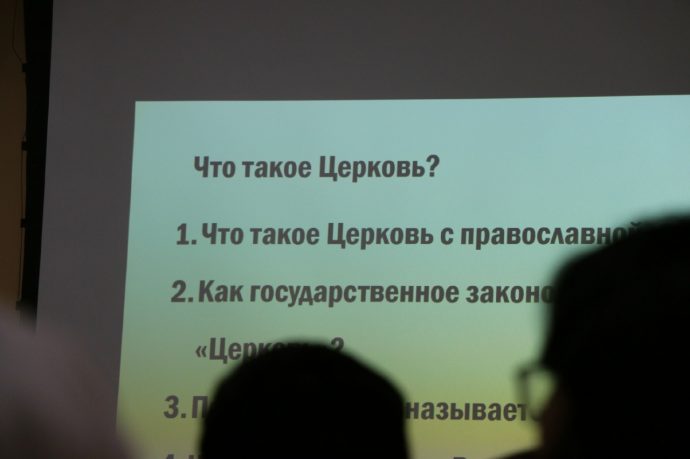 В первой части занятия иерей Николай Евсеев осветил основные моменты истории Русской Церкви, её роль в становлении и развитии русского государства, особенностях жизни в советский период, основных направлениях взаимодействия с современным российским государством. Вторая часть была посвящена ответам на вопросы студентов. Социологов интересовали вопросы учебной и внеучебной жизни семинарии, социальный портрет абитуриента и студента семинарии, история и современность женского духовного образования в России.